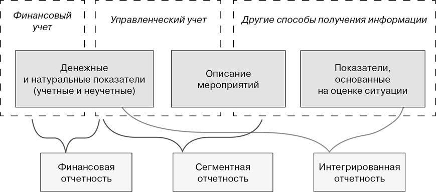 Показатели интегрированной отчетности лишь в незначительном объеме могут быть получены в системе финансового учета, большинство из них формируется в управленческом учете, а также с использованием других методов сбора информации (опросы, анкетирование, исследования рынка).