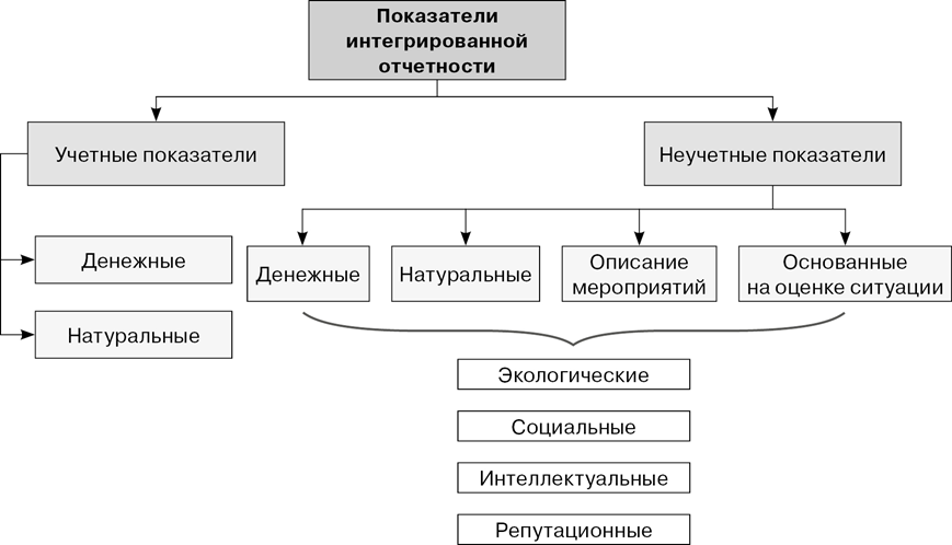 Показатели, отражаемые в интегрированной отчетности, принято классифицировать на финансовые и нефинансовые. Такое деление обусловлено классификацией корпоративной отчетности на финансовую и нефинансовую. В частности, финансовую отчетность можно трактовать как отчетность с финансовыми показателями, экологический и социальный отчеты относятся к группе отчетности с нефинансовыми показателями, отчет в области устойчивого развития и интегрированный отчет — к отчетности с финансовыми и нефинансовыми показателями.