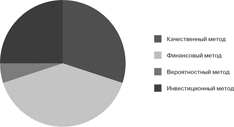 Проанализируем результаты проведенного исследования. Во-первых, стоит отметить, что методы оценки эффективности информационных систем не являются взаимозаменяемыми. Они предназначены для разных целей и могут использоваться параллельно друг с другом. На рис. 1 представлена диаграмма частоты использования методов оценки на предприятиях в процентном соотношении. Из диаграммы видно, что на сегодняшний день вероятностные методы оценки практически не применяются, а финансовые и инвестиционные, в свою очередь, пользуются наибольшей популярностью. Это обусловлено потребностью предприятий в оценке, прежде всего, финансовых затрат и инвестиционных вложений на внедрение и поддержку системы.
