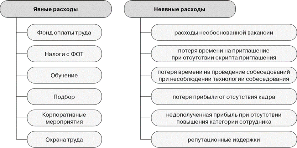 С точки зрения ТСО прямые или бюджетные расходы на персонал определены принятым бюджетом. Существует также вторая группа — это неявные затраты на персонал. Авторы методики ТСО утверждают, что в ряде случаев неявные затраты составляют основную долю совокупной стоимости владения и превышают явные, или прямые, в 3–5 раз. Неявные затраты часто не учитываются и сложно поддаются измерению в количественном выражении. В совокупной стоимости владения персоналом неявные издержки можно выявлять на разных стадиях жизненного цикла сотрудника.