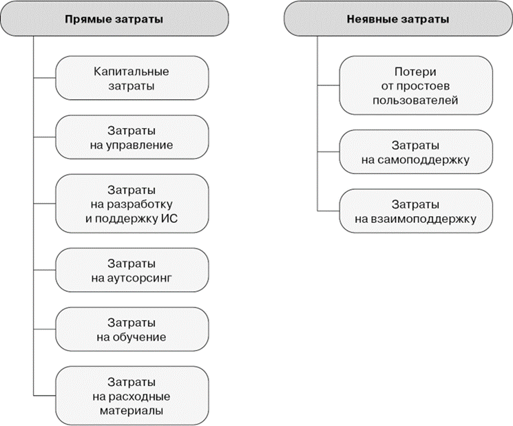 Впервые термин «совокупная стоимость владения» был введен Полем Страссманом. Под ТСО он понимал денежные затраты на обслуживание, модернизацию, ремонт, приобретение новых программных продуктов для технического средства (например, компьютера) или поддержание в рабочем состоянии программного продукта (например, базы данных) за все предполагаемое или фактическое время его существования. Графически основы модели ТСО (как исторически было применительно к информационным системам) представлены на рис. 1. Таким образом, в прямые, или явные, затраты включены все основные бюджетные статьи, величина которых отражена в бухгалтерском балансе предприятия. Это такие издержки, которые можно полностью отнести к товару или услуге. Неявные — это альтернативные затраты фирмы, связанные с использованием своих собственных ресурсов производства продукции. Цель применения методики ТСО — получить картину, которая отражала бы реальные затраты, связанные с приобретением определенных средств и технологий, и учитывала все аспекты их последующего использования. Поскольку впервые эта методика была применена к компьютерным системам, то при ее описании целесообразно приводить примеры, связанные именно с этой сферой. Например, когда принимается решение о приобретении компьютера и при этом используется анализ совокупной стоимости владения, то высокая цена компьютера может рассматриваться как аргумент в пользу более дешевого варианта. Но если к стоимости компьютера добавить затраты, которые могут возникнуть в процессе его эксплуатации, то может оказаться, что общая сумма затрат на покупку и эксплуатацию «дешевой» техники оказывается выше. Значение показателя TCO для каждой закупки должно сравниваться с показателем совокупных выгод владения (Total Benefits of Ownership — TBO) для определения реальной ценности приобретения.