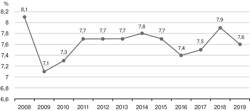 Затраты на логистику в процентах от ВВП США упали примерно с 16 % в 1981 году до почти 11,4 % в 1990 году и оставались в диапазоне 7–8 % за последнее десятилетие. Этот результат стал возможным благодаря значительным улучшениям в управлении запасами, что является ключевым фактором в поддержании стабильных затрат на логистику в США в годовом исчислении на уровне 7–8 % ВВП (рис. 2).