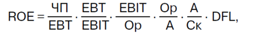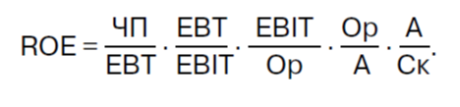 Наиболее полно рассмотрена пятифакторная модель Дюпона, учитывающая факторы, оказывающие влияние на рентабельность собственного капитала. В нее также введено два показателя: EBT — прибыль до уплаты налогов; EBIT — прибыль до уплаты процентов и налогов. Пятифакторная модель имеет вид: