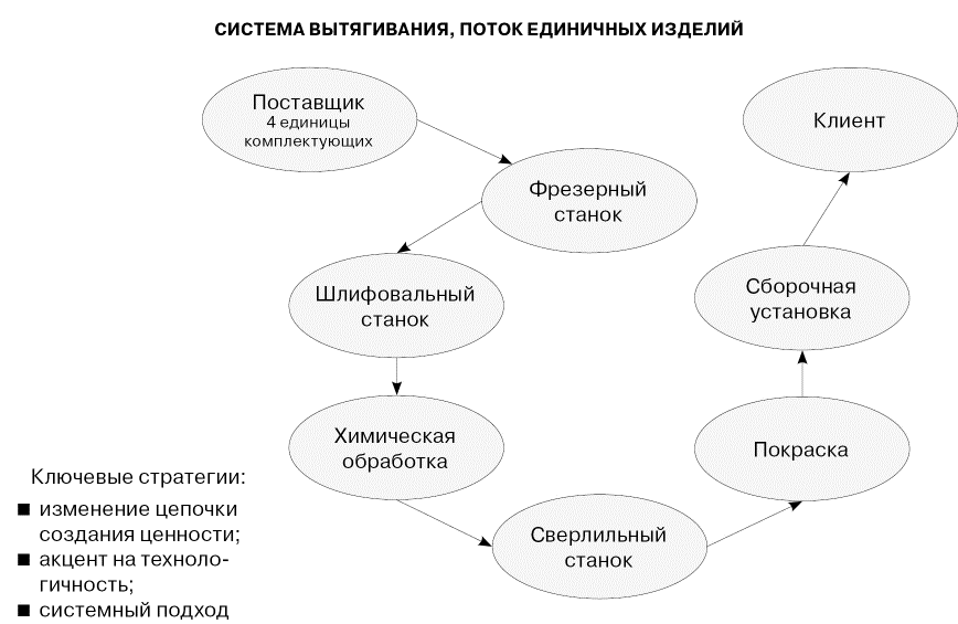 В сущности, стратегия бережливого производства привела к фундаментальному сдвигу производственных парадигм — от традиционной практики массового производства «партиями и очередями» к производственным системам, основанным на потоке единичных изделий и принципе «вытягивания». Сущность заключается в том, что система производства, при которой поставщик, находящийся выше по потоку, ничего не делает до тех пор, пока потребитель, находящийся ниже, ему об этом не сообщит. В то время как при производстве «партиями и очередями» сразу изготавливаются большие объемы товара или комплектующих на основании прогнозируемого спроса, при системе, работающей на основе потока единичных изделий, вся производственная деятельность организована таким образом, что разные шаги осуществляются в строго определенной последовательности, единым потоком. При обоснованной реализации этого принципа колебания спроса не влияют на производство, поскольку предприятие быстро адаптируется к данным колебаниям.