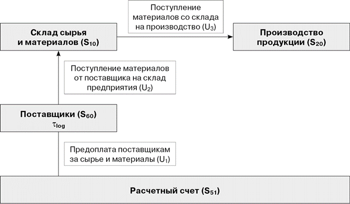 На этой схеме показано, что деньги U1 с расчетного счета S51 поступают к поставщикам S60 на оплату сырья и материалов. Через определенное время tlog материалы U2 поступают на склад S10. Затем, по мере необходимости, материалы U3 отпускают в производство S20.