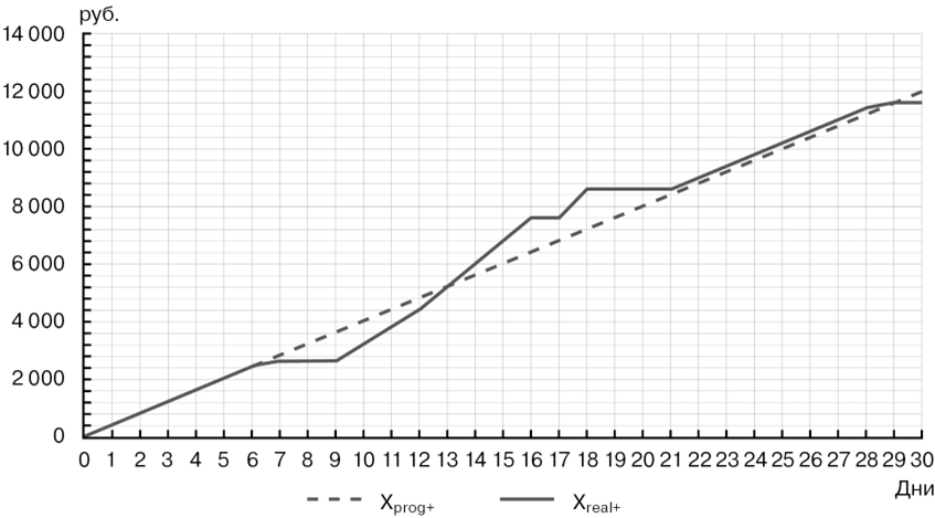 На 5-й день производства, как видно в табл., мы оплатили поставку ресурсов на 3 000 пог. м., но они, с учетом задержки, пришли только на 9-й день. На графике это видно по прямой сплошной линии, означающей простой на предприятии.