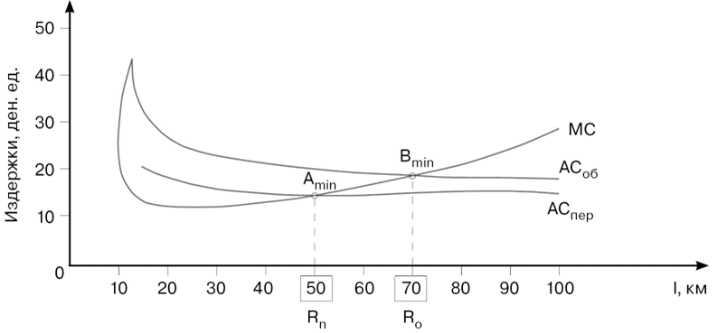 Рис. 2. Определение рационального радиуса действия компании в зависимости от предельных и средних издержек