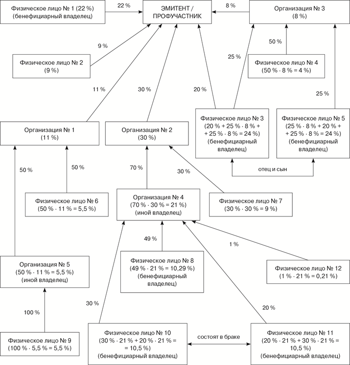 Для осуществления расчета доли находящихся косвенном (через третьих лиц) владении долей в уставном фонде (акций, паев) эмитента, профучастника целесообразно предварительно составлять схему структуры собственности эмитента, профучастника (условный пример такой схемы приведен в приложении к настоящему разъяснению), которая может варьироваться для различных эмитентов, профучастников в зависимости от структуры капитала эмитента, профучастника и (или) лиц, являющихся их участниками (акционерами), иных факторов.