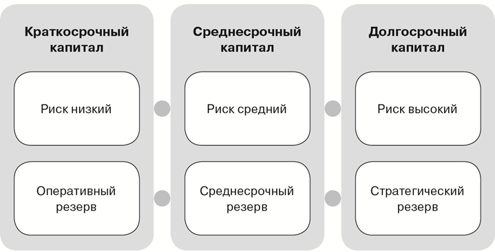 Вследствие того, что концепция бюджетирования, ориентированного на результат, предполагает расширение горизонтов бюджетного планирования, повышает значимость разработки многолетних бюджетов и долгосрочных программ, вопрос о резервировании средств на всех уровнях следует рассматривать в связи с влиянием временного фактора. В частности, комплексный подход требует разделения общей величины единого финансового резерва на три части либо формирования трех самостоятельных резервов (оперативный, среднесрочный и стратегический — рис. 3).