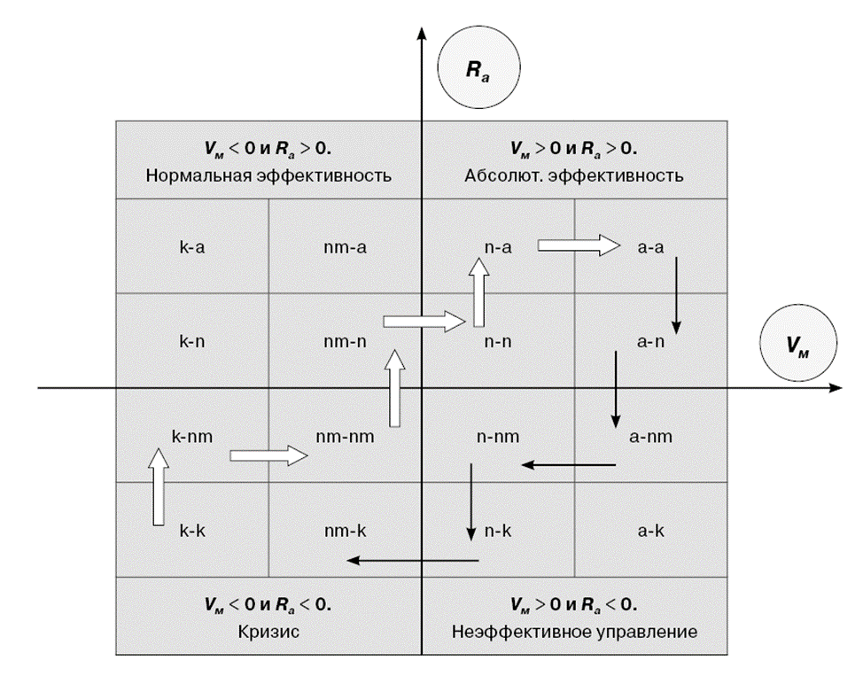 Рис. 1. Диаграмма возможного изменения эффективности управления в координатных осях коэффициента маневренности Vм и рентабельности активов Ra: широкие стрелки — направление повышения эффективности; тонкие стрелки — направление снижения эффективности