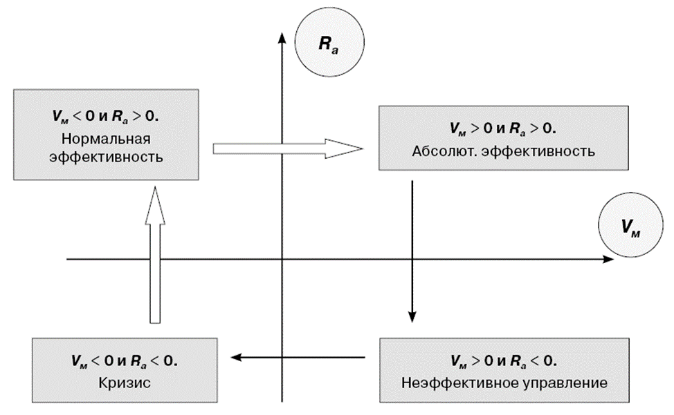 Такое уточнение стало возможным только при численном представлении эффективности управления через Rа и Vм. При этом из двух рассматриваемых переменных Rа и Vм преимущество оценки эффективности управления внутри каждого квадранта принадлежит изменению рентабельности активов как показателю деловой активности предприятия. Наличие активов, финансируемых из собственного капитала (показатель Vм), имеет вторичное значение.